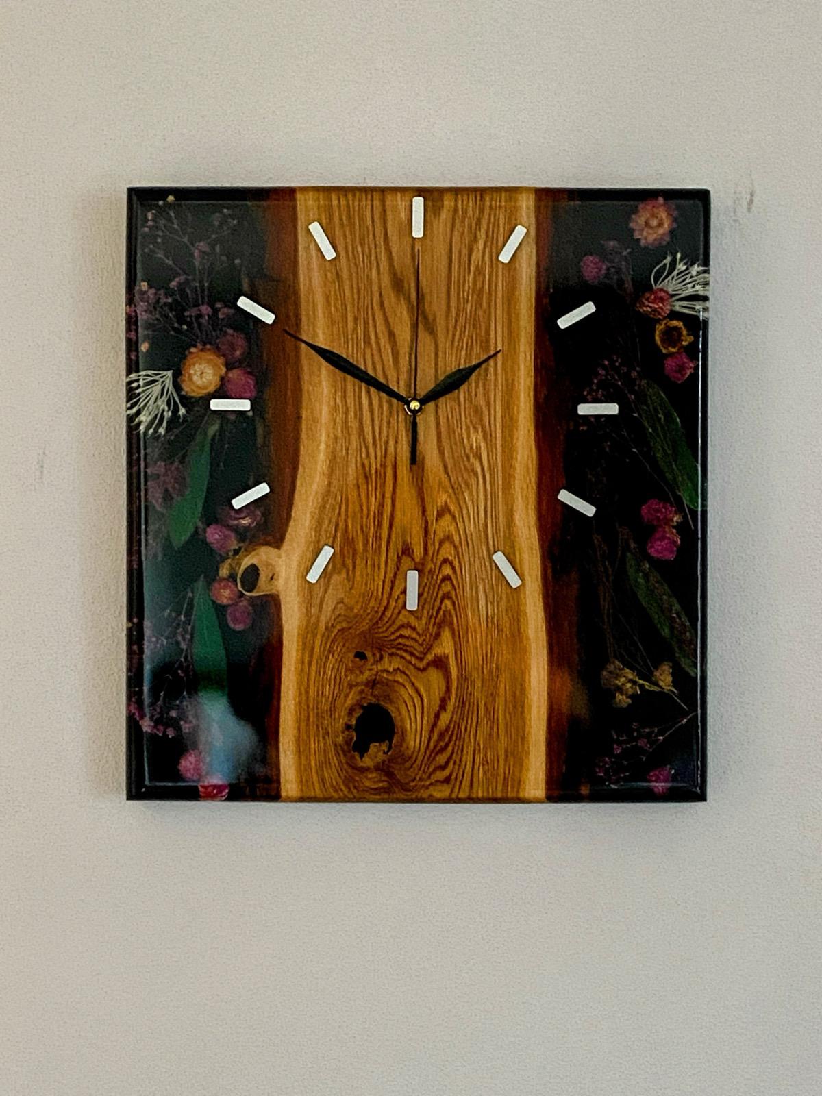 v ktorom sú osadené kvety. Toto prevedenie hodinám dodáva efektné 3D prevedenie. Objavte krásu a originalitu našich epoxidových hodín, kde žiadne dva kusy nie sú identické. Na zadnej strane hodín je háčik na zavesenie. Tichý motorček.