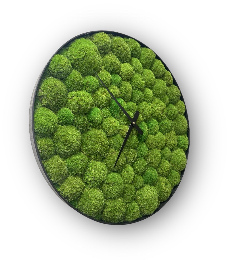 Machové hodiny BOLMOSS ponúkame v priemere 50,60 a 70cm, obsahuje lišajníkový, kopčekový a plochý mach s drevenou kôrou. Drevený dubový rám vo farebných odtieňoch Biela, Čierna, Hnedá, Šedá alebo v lakoch svetlý Dub, Orech alebo Tmavý palisander. Farbu rámu napíšte do poznámky pri objednávke.