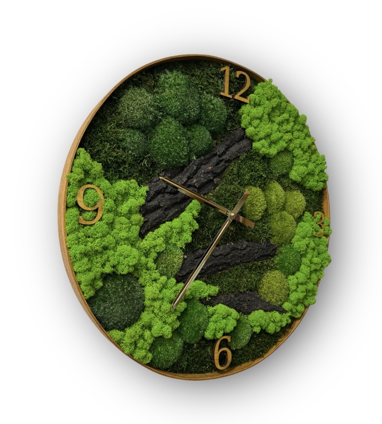 Machové hodiny GARDEN ponúkame v priemere 50,60 a 70cm, obsahuje lišajníkový, kopčekový a plochý mach s drevenou kôrou. Drevený dubový rám vo farebných odtieňoch Biela, Čierna, Hnedá, Šedá alebo v lakoch svetlý Dub, Orech alebo Tmavý palisander. Farbu rámu napíšte do poznámky pri objednávke.