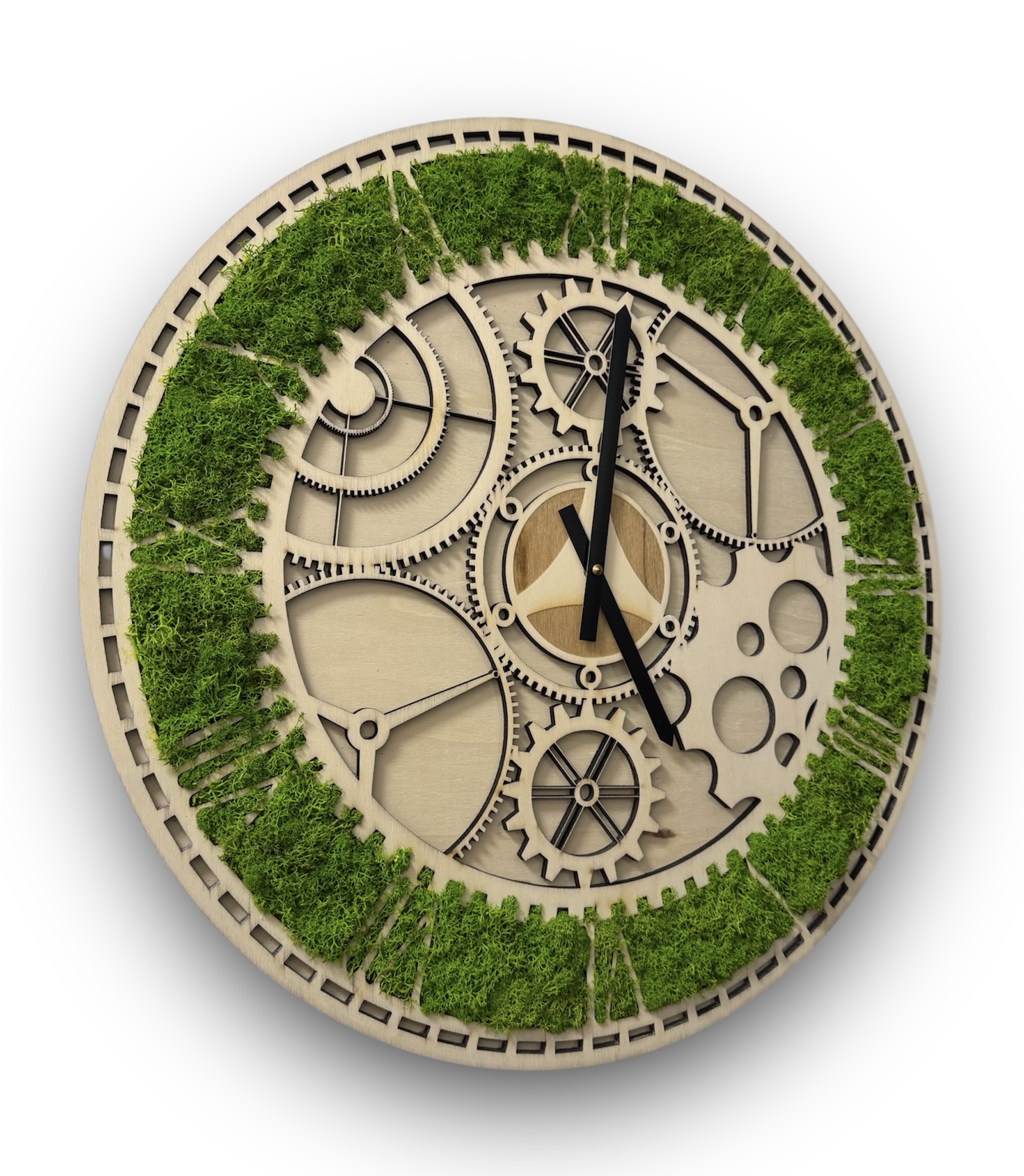 Machové hodiny KOLESO v priemeroch 50 a 60cm, obsahuje lišajníkový svetlý mach, farba dreva je prírodná.