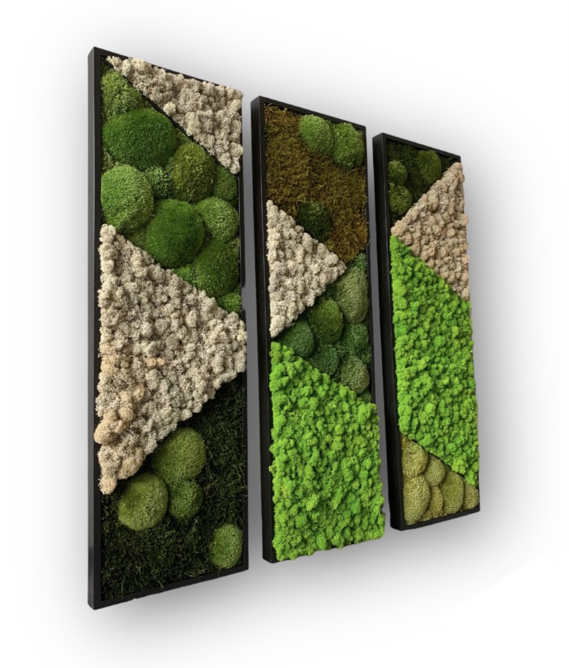 Machový 3-obraz MOZAIKA, vyrobený z lišajníkov, kopčekových a plochých machov, drevený farbený rám v odtieňoch Biela, Čierna, Hnedá, Šedá alebo v  lakoch svetlý Dub, Orech alebo Tmavý palisander.