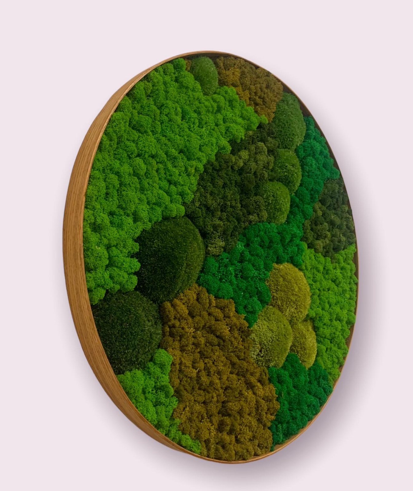 Machový obraz kruh 1, je vyrobený z lišajníkov a kopčekových machov. Drevený dubový farbený rám v odtieňoch Biela, Čierna, Hnedá, Šedá alebo v lakoch svetlý Dub, Orech alebo Tmavý palisander.
