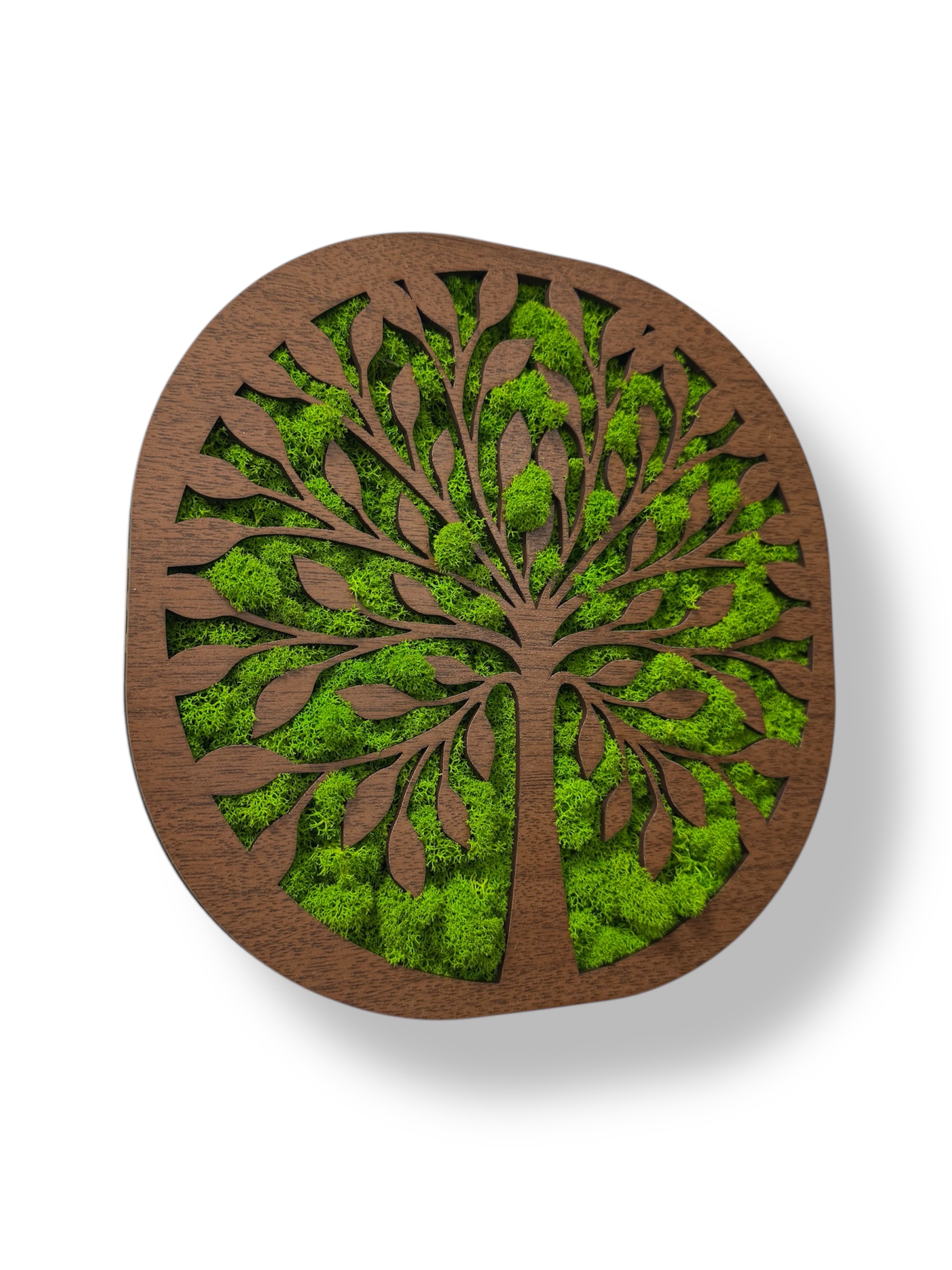 Machový strom života Harmônia 1 je vyrábaný v priemeroch (v najširšom bode) 27, 38, 49 a 60 cm. Použitý je lišajníkový mach v kombinácii s dekorom dreva v odtieni tmavý orech.