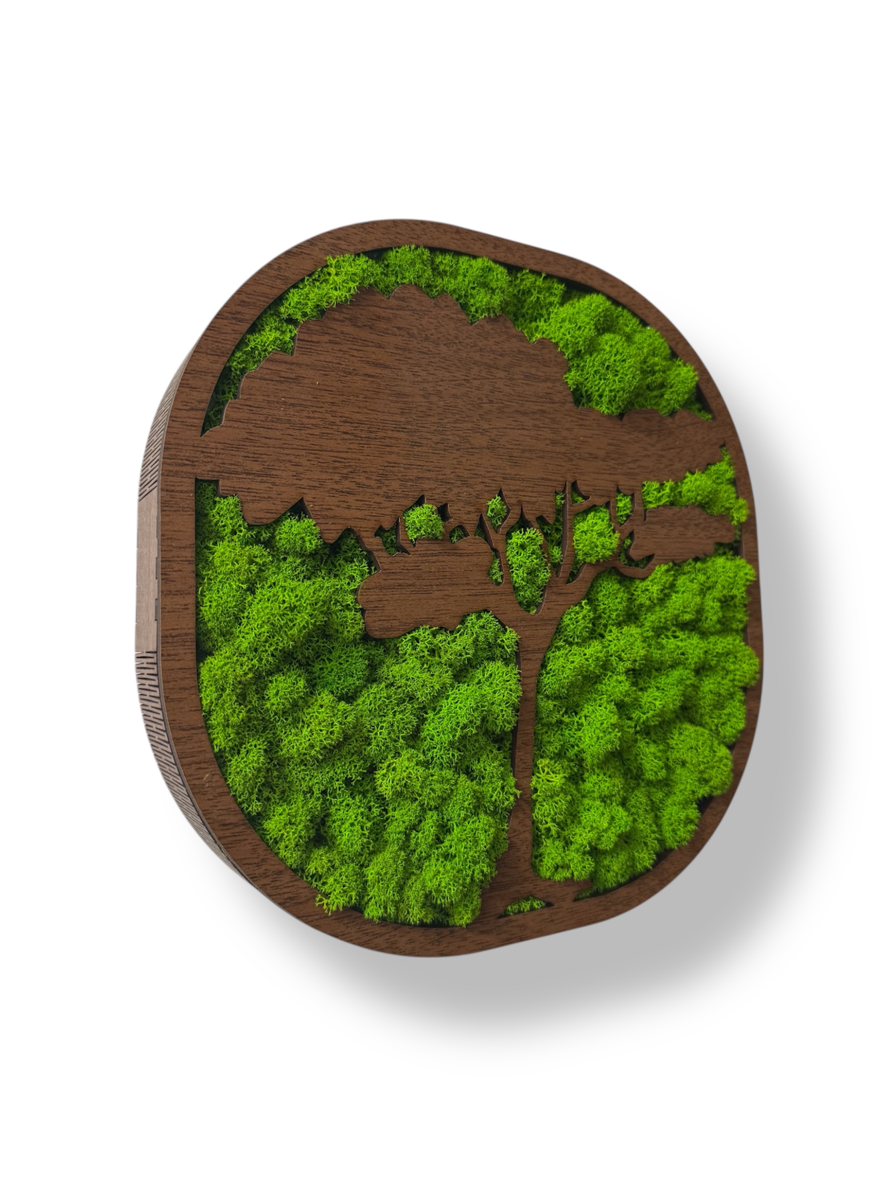 Machový strom života Harmônia 2 je vyrábaný v priemeroch (v najširšom bode) 27, 38, 49 a 60 cm. Použitý je lišajníkový mach v kombinácii s dekorom dreva v odtieni tmavý orech.