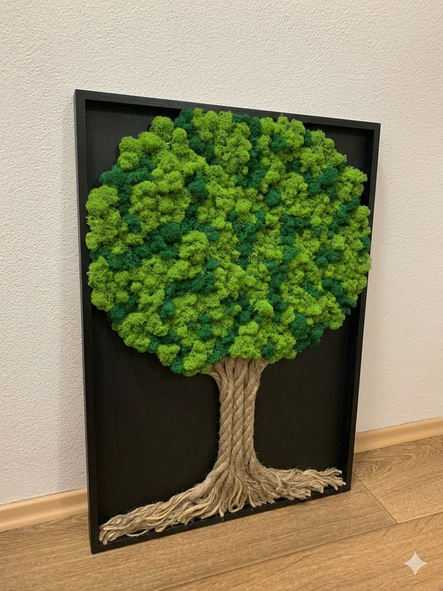 Machový strom života v ráme s lišajníkovým machom v čiernom prevedení rámu a pozadia.